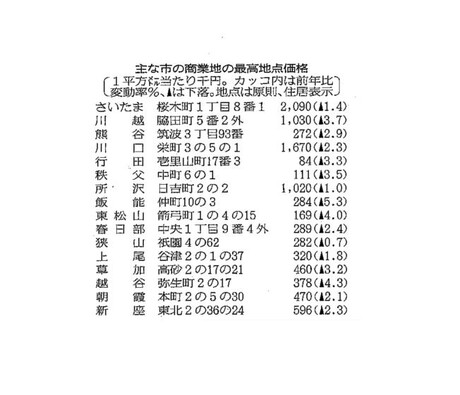 国土交通省が3月22日発表した2012年公示地価(1月1日時点)による、埼玉県の地価は平均価格で、住宅地は2.3%下落、商業地は2.6%下落した。県南部はマンション需要など底堅い動きがあるが、景気の先行き不安などで県内の底入れには時間がかかりそうです。日本経済新聞より2012/3/25